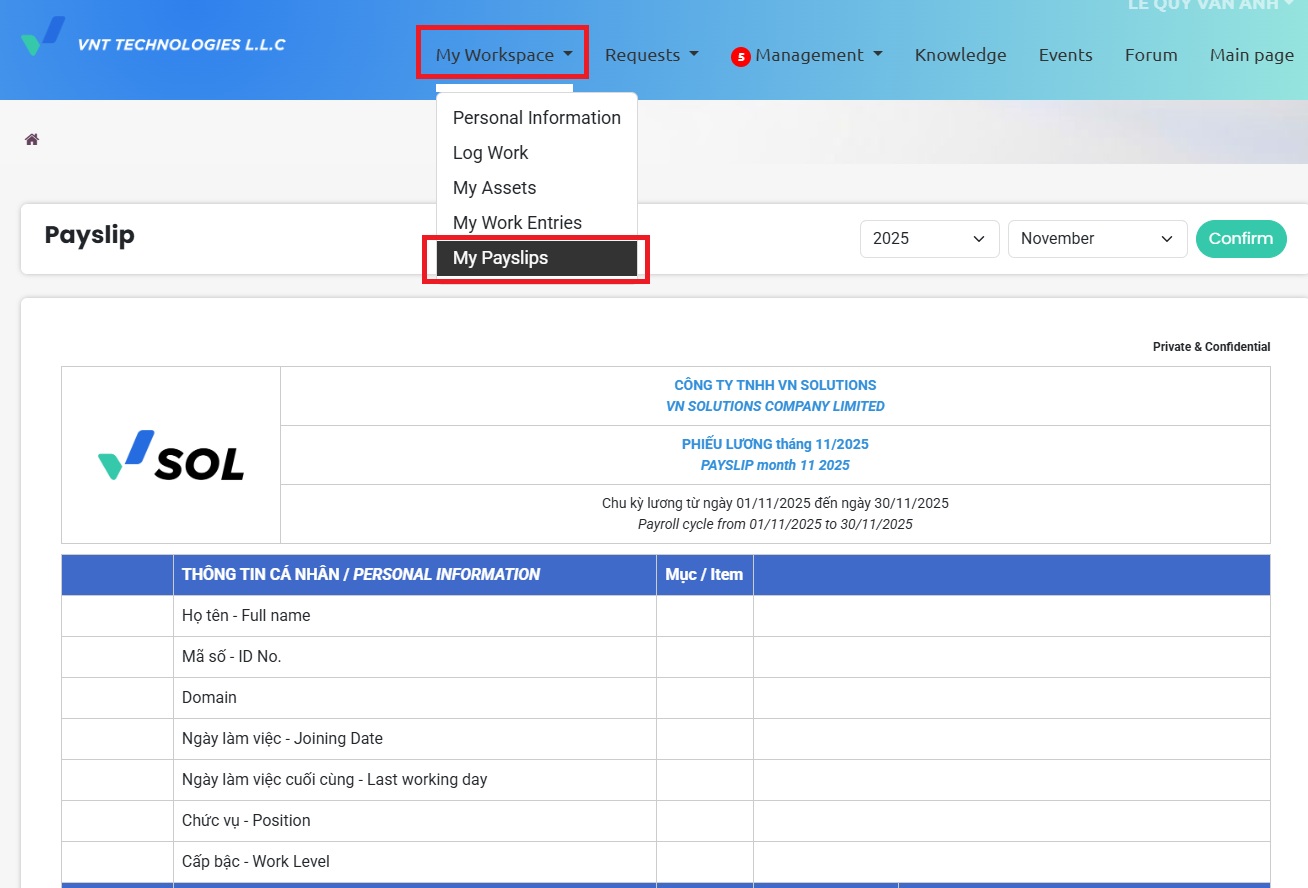 - Log in to Odoo using your personal account and navigate to My Workspace → My PaySlips.